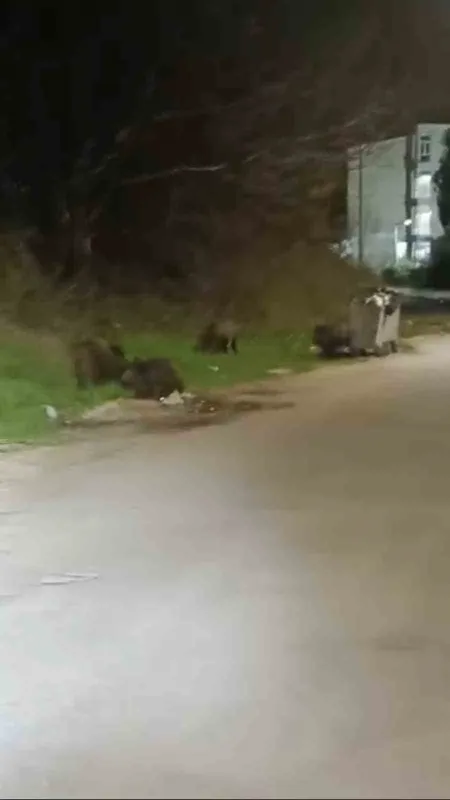 Bursa’da gece saatlerinde mahalleye inen domuz sürüsü yiyecek aradı. O anlar cep telefonu kamerasına yansıdı.