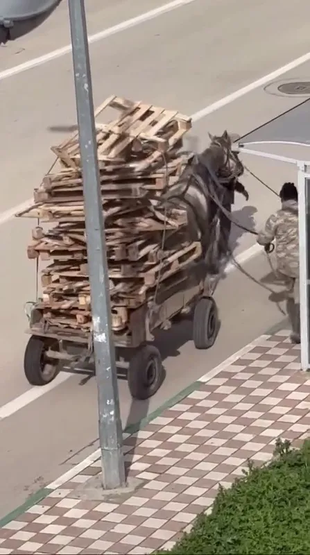 Bursa’nın Karacabey ilçesinde kimliği henüz öğrenilemeyen bir kişi, at arabasına kat kat palet yükledi. Aşırı yük nedeniyle yükün ağırlığı altında güçlükle ilerleyen atın dengesini sağlamakta zorlandığı anlar, çevrede bulunan bir vatandaş tarafından cep telefonu kamerasıyla kaydedildi.